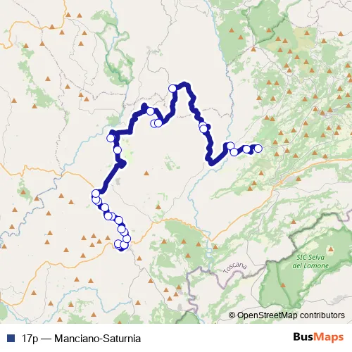 The first stop of the 17p bus route is Manciano Arlecchino and the last stop is Sovana. 17p (Manciano-Saturnia) is operational during tutti i giorni.