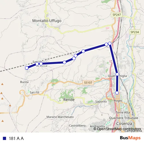 The first stop of the 181 A A bus route is Corso V. Emanuele, 4 - Montalto Uffugo and the last stop is Via Don Giovanni Minzoni, 13 - Rende. 181 A A is operational during tutti i giorni.
