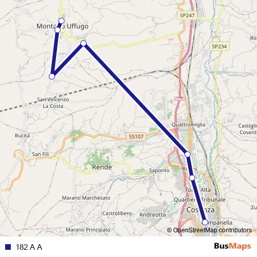 The first stop of the 182 A A bus route is Via R. Leoncavallo, 2 - Montalto Uffugo and the last stop is Autostazione Cosenza - Cosenza. 182 A A is operational during tutti i giorni.