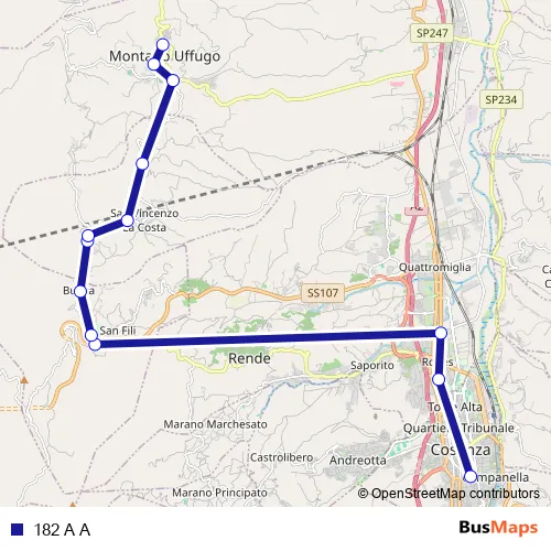 The first stop of the 182 A A bus route is Autostazione Cosenza - Cosenza and the last stop is Via R. Leoncavallo, 2 - Montalto Uffugo. 182 A A is operational during tutti i giorni.