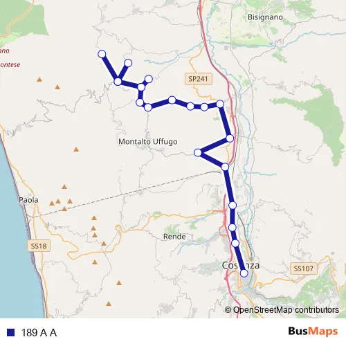 The first stop of the 189 A A bus route is Via San Francesco, 43 - Rota Greca and the last stop is Autostazione Cosenza - Cosenza. 189 A A is operational during tutti i giorni.