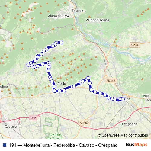 The first stop of the 191 bus route is Cavaso Parrocchia and the last stop is Montebelluna Ff.Ss. p. 191 (Montebelluna - Pederobba - Cavaso - Crespano) is operational during tutti i giorni.