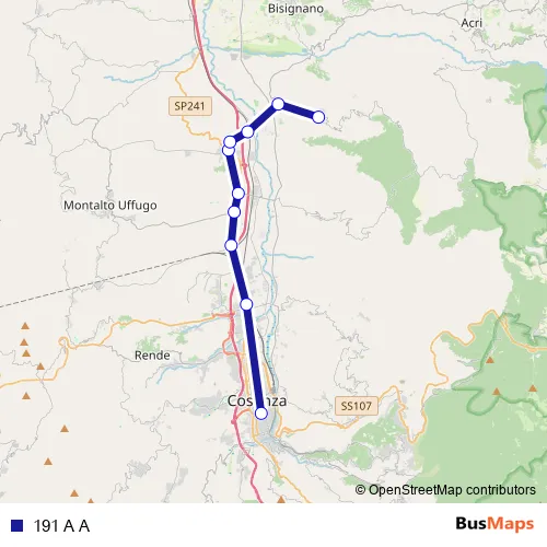 The first stop of the 191 A A bus route is Autostazione Cosenza - Cosenza and the last stop is Via Incoronata, 5 - Luzzi. 191 A A is operational during tutti i giorni.