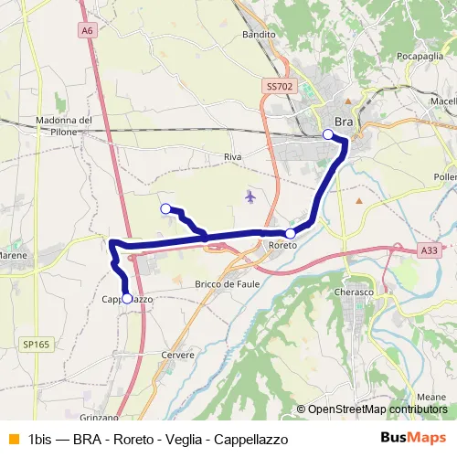 The first stop of the 1bis bus route is Cherasco - Fraz. Cappellazzo and the last stop is BRA - P.Zza Roma Fs. 1bis (BRA - Roreto - Veglia - Cappellazzo) is operational during tutti i giorni.