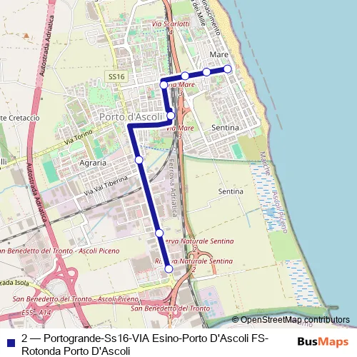 The first stop of the 2 bus route is S. Benedetto DEL TR. - Centro Comm. Port and the last stop is V.Mare Rotonda. 2 (Portogrande-Ss16-VIA Esino-Porto D'Ascoli FS-Rotonda Porto D'Ascoli) is operational during tutti i giorni.