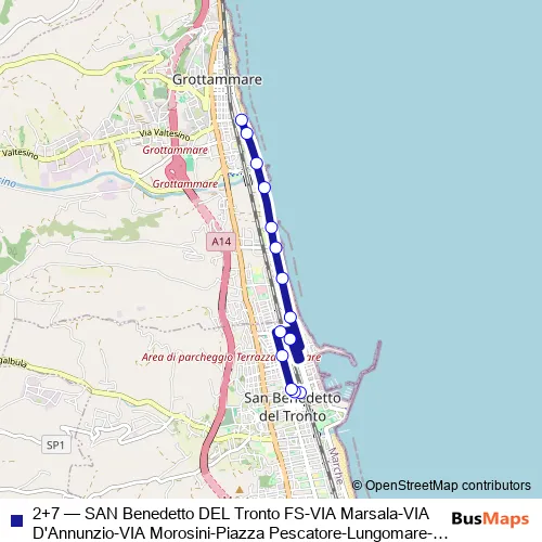 The first stop of the 2+7 bus route is S. Benedetto DEL TR. - Stazione Ffss and the last stop is Grottammare - Hotel Marconi. 2+7 (SAN Benedetto DEL Tronto FS-VIA Marsala-VIA D'Annunzio-VIA Morosini-Piazza Pescatore-Lungomare-Rifornimento Ip) is operational during tutti i giorni.