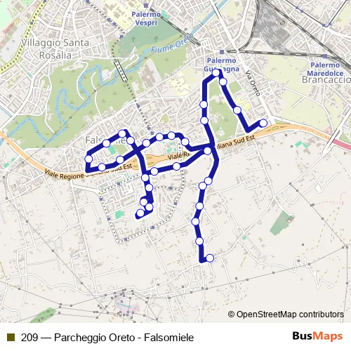 The first stop of the 209 bus route is Regione Siciliana Oreto and the last stop is Falsomiele Barresi. 209 (Parcheggio Oreto - Falsomiele) is operational during tutti i giorni.