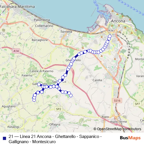 The first stop of the 21 bus route is Montesicuro and the last stop is Piazza U.Bassi. 21 (Linea 21 Ancona - Ghettarello - Sappanico - Gallignano - Montesicuro) is operational during tutti i giorni.