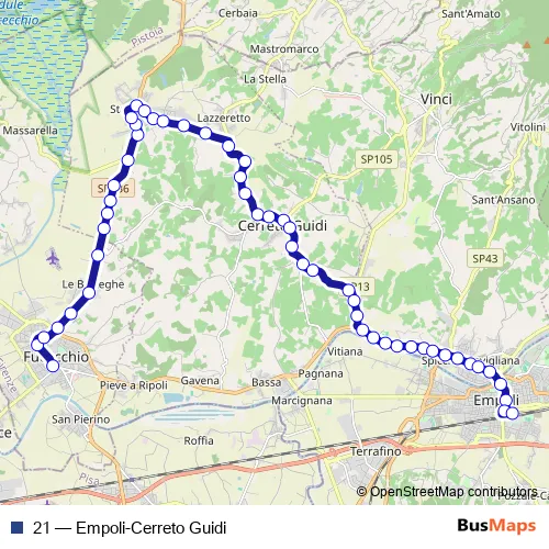 See why over 2 million users trust and consider busmaps.com as the best public transport website. busmaps gives you Cerreto Guidi Buses suggested routes, real-time bus tracker, line route maps in Cerreto Guidi, and helps to find the closest 21 bus stops near you. No internet available? Download an offline PDF map and bus schedule for the 21 bus to take on your trip.
