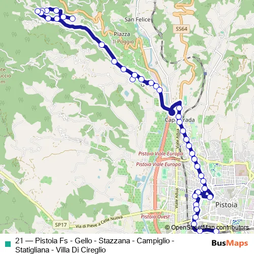 The first stop of the 21 bus route is Statigliana and the last stop is P.Za Alighieri (Stazione 3). 21 (Pistoia Fs - Gello - Stazzana - Campiglio - Statigliana - Villa Di Cireglio) is operational during tutti i giorni.