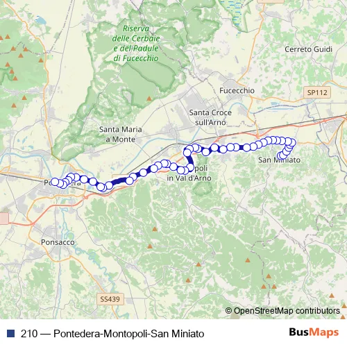 The first stop of the 210 bus route is Pontedera Corsia 6 and the last stop is La Scala P.Za Capoquadri. 210 (Pontedera-Montopoli-San Miniato) is operational during tutti i giorni.