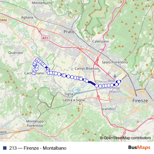 The first stop of the 213 bus route is Carmignano and the last stop is Firenze T2 Guidoni P1. 213 (Firenze - Montalbano) is operational during tutti i giorni.
