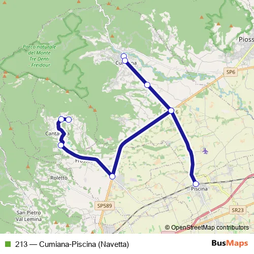 The first stop of the 213 bus route is Cantalupa - Piazza Coassolo - VIA Sant' Antonio 100 and the last stop is Piscina - Stazione Ferroviaria. 213 (Cumiana-Piscina (Navetta)) is operational during nei giorni feriali.