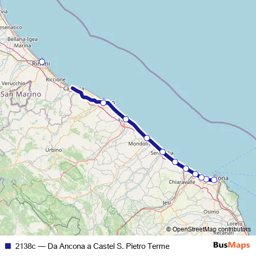 The first stop of the 2138c rail route is Ancona and the last stop is Rimini. 2138c (Da Ancona a Castel S. Pietro Terme) is operational during nel fine settimana.