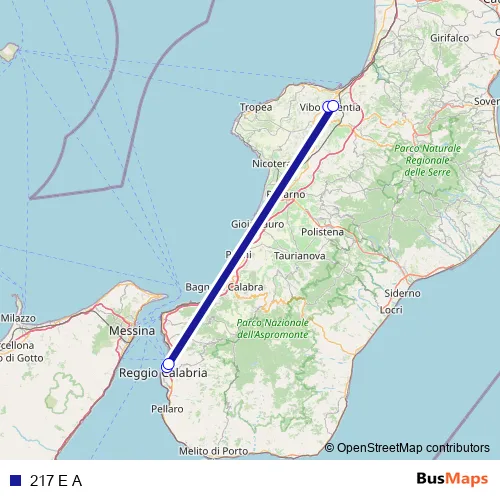The first stop of the 217 E A bus route is Via Alessandro Manzoni, 38 - Vibo Valentia and the last stop is Via Clearco, 5 - Reggio di Calabria. 217 E A is operational during tutti i giorni.