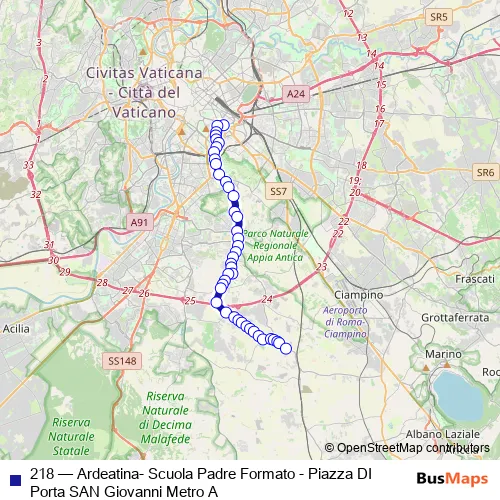 The first stop of the 218 bus route is Piazza DI Porta SAN Giovanni Metro A and the last stop is Ardeatina/Scuola Padre Formato. 218 (Ardeatina- Scuola Padre Formato - Piazza DI Porta SAN Giovanni Metro A) is operational during nel fine settimana.