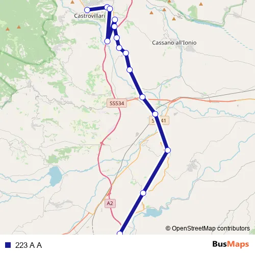 The first stop of the 223 A A bus route is Castrovillari Autostazione, Via Novembre, 2 - Castrovillari and the last stop is Strada Statale 19 delle Calabrie - Tarsia. 223 A A is operational during tutti i giorni.