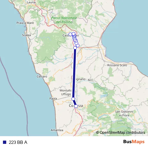 The first stop of the 223 BB A bus route is Autostazione Cosenza - Cosenza and the last stop is Castrovillari Autostazione, Via degli Osci - Castrovillari. 223 BB A is operational during tutti i giorni.