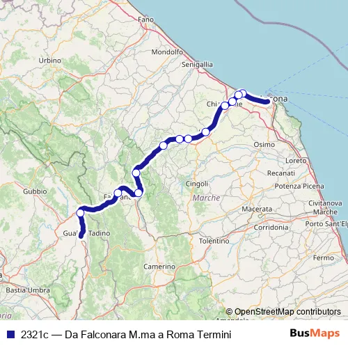 The first stop of the 2321c rail route is Falconara M.ma and the last stop is Fossato di V.-Gubbio. 2321c (Da Falconara M.ma a Roma Termini) is operational during nel fine settimana.