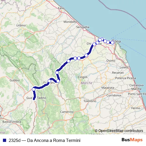 The first stop of the 2325d rail route is Ancona and the last stop is Fossato di V.-Gubbio. 2325d (Da Ancona a Roma Termini) is operational during tutti i giorni.