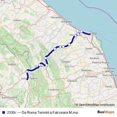 The first stop of the 2330c rail route is Fossato di V.-Gubbio and the last stop is Falconara M.ma. 2330c (Da Roma Termini a Falconara M.ma) is operational during tutti i giorni.