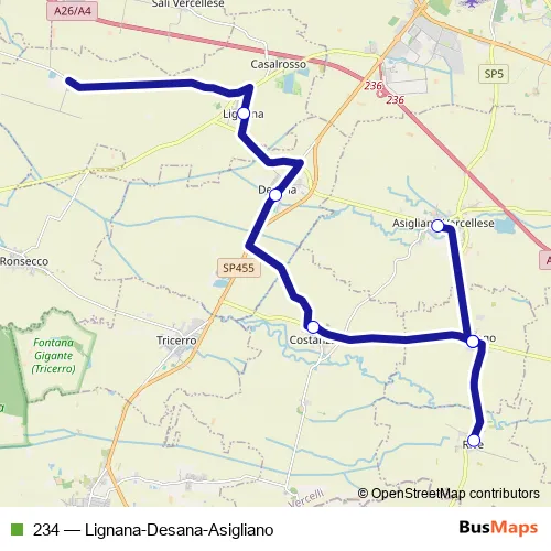 The first stop of the 234 bus route is Asigliano - Piazza Vittorio Veneto and the last stop is Lignana - VIA Roma. 234 (Lignana-Desana-Asigliano) is operational during nei giorni feriali.