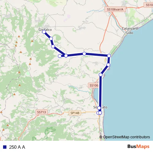See why over 2 million users trust and consider busmaps.com as the best public transport website. busmaps gives you Soverato Marina Buses suggested routes, real-time bus tracker, line route maps in Soverato Marina, and helps to find the closest 250 A A bus stops near you. No internet available? Download an offline PDF map and bus schedule for the 250 A A bus to take on your trip.
