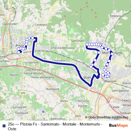 The first stop of the 25o bus route is Oste (Capolinea) and the last stop is P.Za Dante Alighieri (Questura). 25o (Pistoia Fs - Santomato - Montale - Montemurlo - Oste) is operational during tutti i giorni.