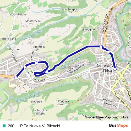 The first stop of the 260 bus route is P.Ta Nuova - Scuole Medie and the last stop is Colle V.Elsa (V.Bilenchi). 260 (P.Ta Nuova-V. Bilenchi) is operational during nei giorni feriali.
