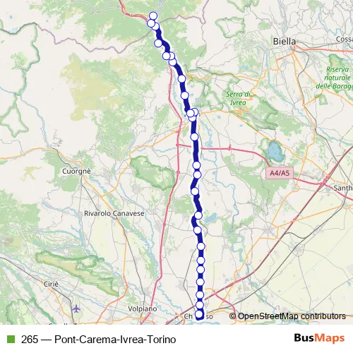 The first stop of the 265 bus route is Chivasso - Movicentro - Piazza Garibaldi and the last stop is Pont Saint Martin - Piazza IV Novembre. 265 (Pont-Carema-Ivrea-Torino) is operational during tutti i giorni.