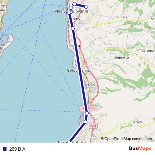The first stop of the 269 B A bus route is dei Piani d'Aspromonte, 175 - Campo Calabro and the last stop is Via Missori, 39 - Reggio di Calabria. 269 B A is operational during tutti i giorni.