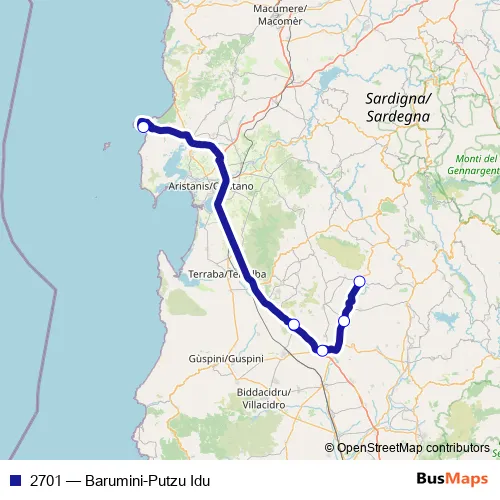 The first stop of the 2701 bus route is Fermata di Barumini VIA Roma 26 and the last stop is Fermata di Putzu IDU (SAN Vero Milis). 2701 (Barumini-Putzu Idu) is operational during tutti i giorni.
