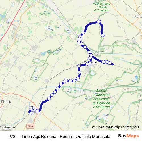 The first stop of the 273 bus route is Ospitale Monacale and the last stop is Budrio Stazione. 273 (Linea Agi: Bologna - Budrio - Ospitale Monacale) is operational during tutti i giorni.