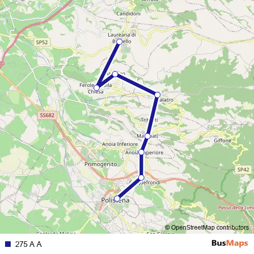 The first stop of the 275 A A bus route is Viale Italia, 56 - Polistena and the last stop is Viale Margherita, 46 - Laureana di Borrello. 275 A A is operational during tutti i giorni.