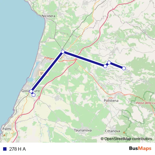 The first stop of the 278 H A bus route is Strada Provinciale 1, 243 - Gioia Tauro Terminal Bus - Gioia Tauro and the last stop is Via Alessandro Volta, 2 - Galatro. 278 H A is operational during tutti i giorni.