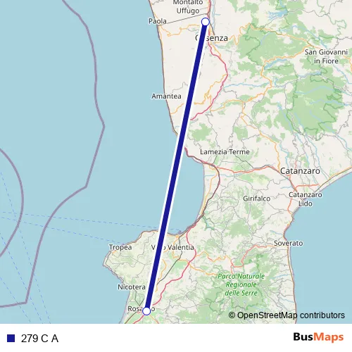 The first stop of the 279 C A bus route is Autostrada A2 Mediterranea - Rosarno and the last stop is Università della Calabria - Arcavacata - Cosenza. 279 C A is operational during tutti i giorni.