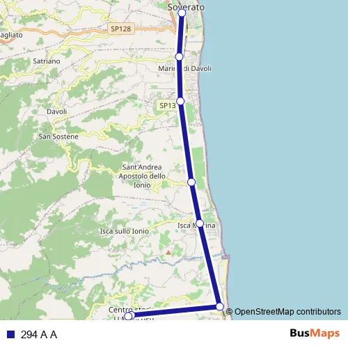 The first stop of the 294 A A bus route is Via Trento e Trieste, 100 - Soverato and the last stop is Via Provinciale, 64 - Badolato. 294 A A is operational during tutti i giorni.