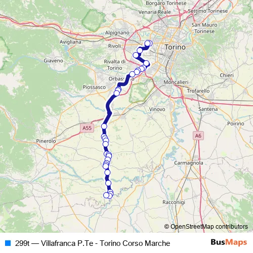 The first stop of the 299t bus route is Torino - C.So Marche and the last stop is Villafranca P.Te - V. Cavour -FR. Scuole. 299t (Villafranca P.Te - Torino Corso Marche) is operational during nei giorni feriali.
