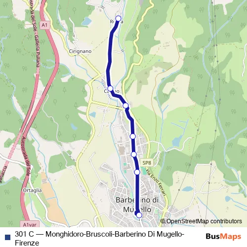 The first stop of the 301 C bus route is La Ruzza and the last stop is Barberino Centro Cavour. 301 C (Monghidoro-Bruscoli-Barberino Di Mugello-Firenze) is operational during tutti i giorni.