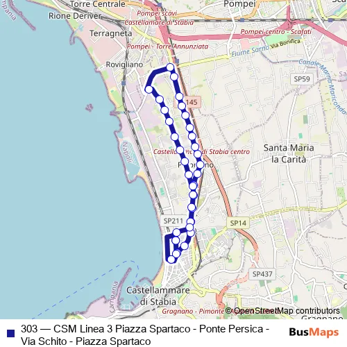See why over 2 million users trust and consider busmaps.com as the best public transport website. busmaps gives you Castellammare di Stabia Buses suggested routes, real-time bus tracker, line route maps in Castellammare di Stabia, and helps to find the closest 303 bus stops near you. No internet available? Download an offline PDF map and bus schedule for the 303 bus to take on your trip.