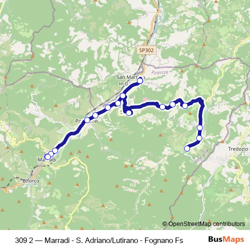 The first stop of the 309 2 bus route is Lutirano * and the last stop is Marradi Teatro P*. 309 2 (Marradi - S. Adriano/Lutirano - Fognano Fs) is operational during tutti i giorni.