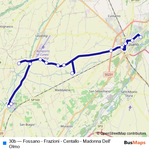 The first stop of the 30b bus route is Fossano - Itis Portone Viale Vallauri and the last stop is Centallo - VIA Piave Rotonda. 30b (Fossano - Frazioni - Centallo - Madonna Dell'Olmo) is operational during tutti i giorni.