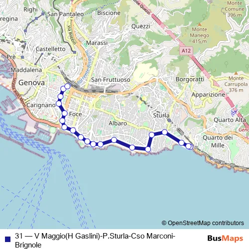 The first stop of the 31 bus route is V Maggio 5/Ospedale Gaslini and the last stop is Brignole FS/Capolinea. 31 (V Maggio(H Gaslini)-P.Sturla-Cso Marconi-Brignole) is operational during tutti i giorni.
