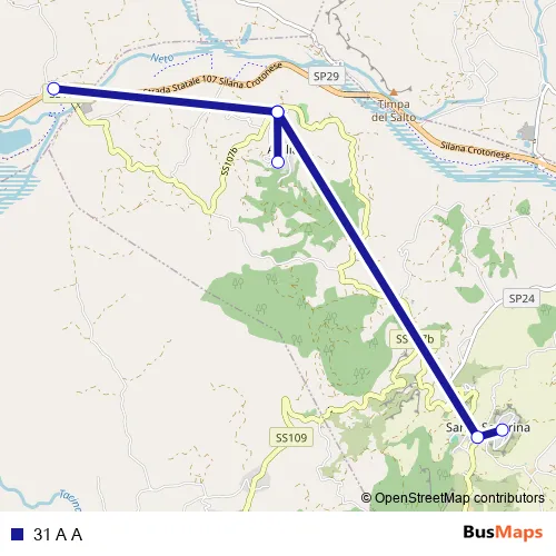 The first stop of the 31 A A bus route is Strada Statale 107 Silana Crotonese - Caccuri and the last stop is Via Miserì A, 8 - Santa Severina. 31 A A is operational during tutti i giorni.