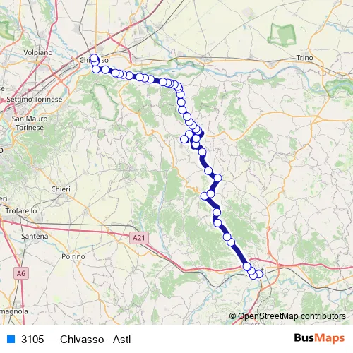 The first stop of the 3105 bus route is Fermata 10730 - Asti (Capolinea) and the last stop is Fermata 10544 - Chivasso (Movicentro). 3105 (Chivasso - Asti) is operational during tutti i giorni.