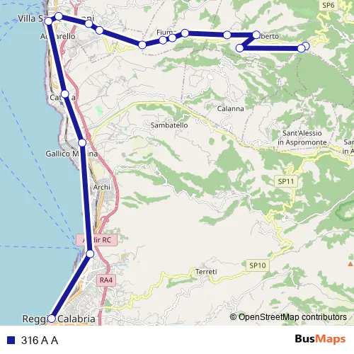 The first stop of the 316 A A bus route is Via Arangiarella, 20 - San Roberto and the last stop is Via Missori, 39 - Reggio di Calabria. 316 A A is operational during tutti i giorni.