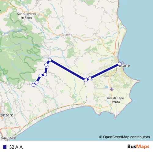 The first stop of the 32 A A bus route is Via Pirro, 7 - Sersale and the last stop is Via Giuseppe di Vittorio, 23 - Crotone. 32 A A is operational during tutti i giorni.