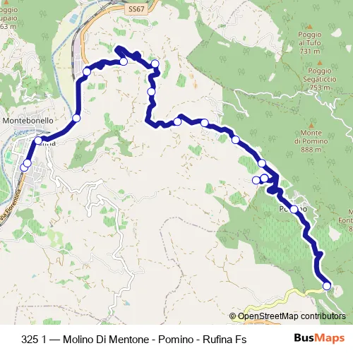 The first stop of the 325 1 bus route is Rufina Stazione Fs * P and the last stop is Molino Di Mentone Capolinea. 325 1 (Molino Di Mentone - Pomino - Rufina Fs) is operational during tutti i giorni.