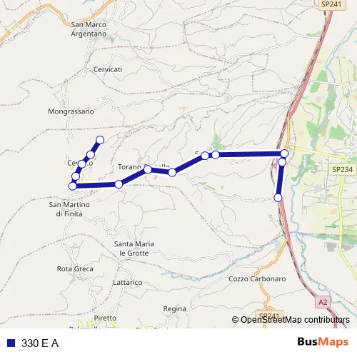 The first stop of the 330 E A bus route is Via Gjitonia Catundi - Cerzeto and the last stop is Autostrada A2 Mediterranea - Torano Castello. 330 E A is operational during tutti i giorni.