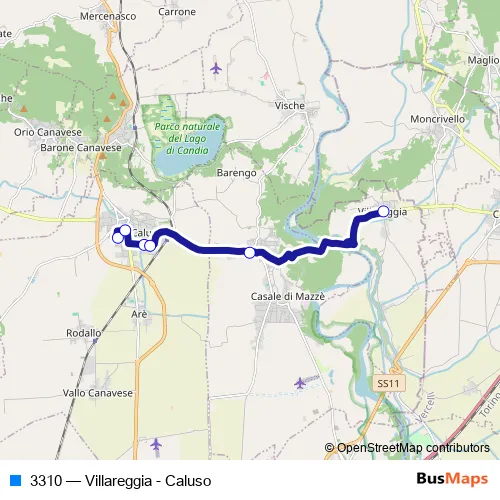 The first stop of the 3310 bus route is Fermata 17939 - Caluso (V. Montello) and the last stop is Fermata 23765 - Villareggia (P.Za Vallero). 3310 (Villareggia - Caluso) is operational during nei giorni feriali.